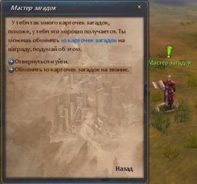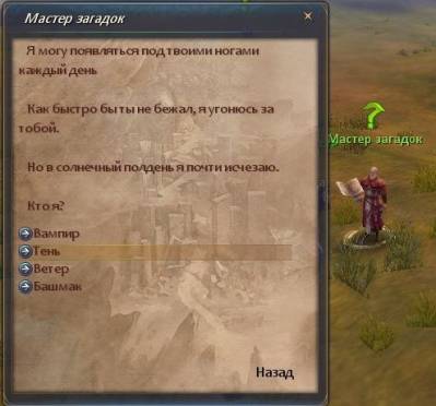 В случае правильного ответа - он выдаст вам Митику (Иногда и не дает) После того как вы ответите не спешите уходить, спустя буквально минуту он снова может дать вам квест-загадку. Но т.к. его появление в том или ином месте случайно - исчезнуть он может тоже в любое время. Не редко бывали случаи, что Мастер загадывает загадку и исчезает. Чтобы избавиться от квеста вам придется снова найти его. В этом вам поможет карта с отмеченными местами появления Мастера загадок Собрав 10 Митик и найдя Мастера загадок - он предложит вам обменять их После обмена вы получите опыт и новый титул Мастер Головоломок к сожалению ответов нет только переведеные с китайского http://translate.google.ru/translate?hl=ru&sl=auto&tl=ru&u=http%3A%2F%2Fshenmo.178.com%2Fmzst%2F | |